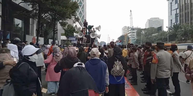 “Keuntungan PCR sudah mencapai Rp10 triliun. Kemana itu? Sedangkan kami, rakyat tahu, 70 persen harta pejabat meningkat di masa pandemi. Tidakkah kalian malu?” seru salah seorang orator wanita dari atas mobil komando.