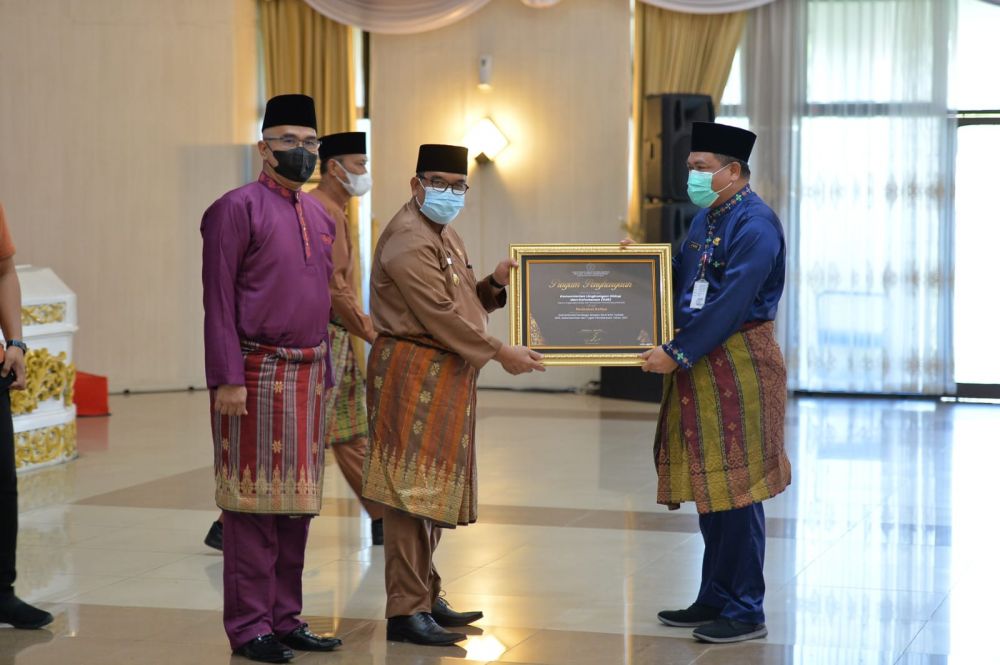 Penghargaan tersebut diserahkan oleh Wakil Gubernur Riau (Wagubri) Edy Natar Nasution kepada Kepala DLHK Riau Mamun Murod dan disaksikan oleh Kakanwil DJPb Riau Ismed Saputra di Balai Serindit Gedung Daerah Provinsi Riau dalam agenda Rapat Koordinasi Daerah (Rakorda) Pelaksanaan Anggaran Pusat dan Daerah Tahun 2022, Jumat (22/4/2022).